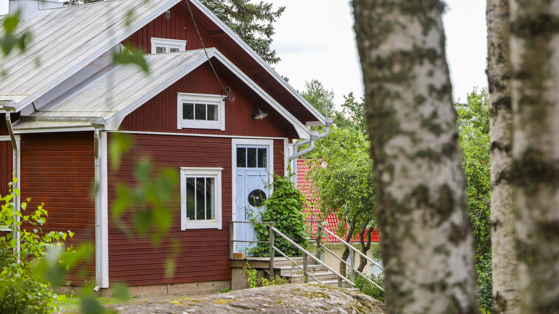 Friisilän verstasalueen punainen päärakennus. Etualalla koivuja.
