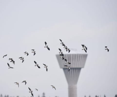 Parvi muuttavia töyhtöhyyppiä, joiden taustalla on Raision vesitorni