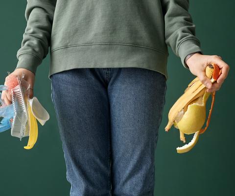 Henkilö pitää käsissään erilaisia roskia, kropasta näkyy vain alaosa.