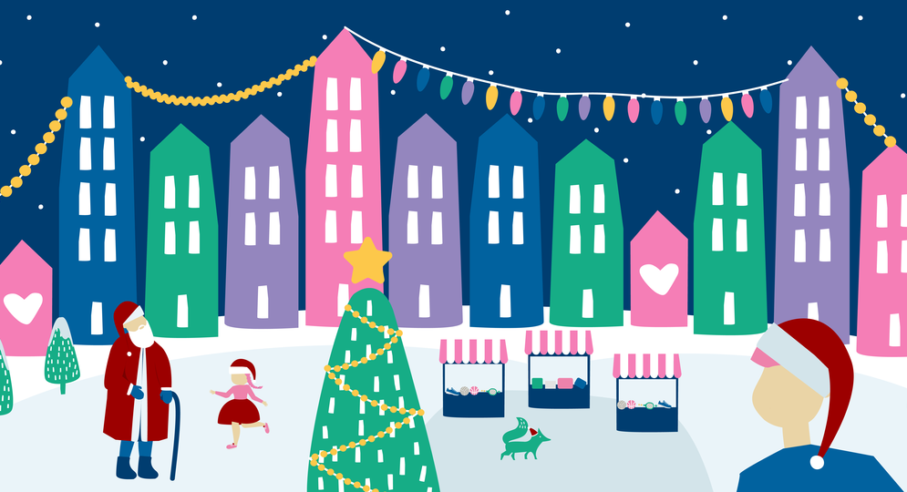 Jouluinen kuvituskuva, jossa taloja, ihmisiä, joulupukki ja torimaisema.