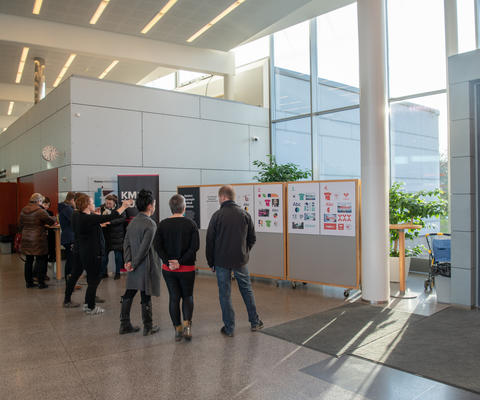Ihmiset katsovat näyttelyä Kirjastotalon aulassa.
