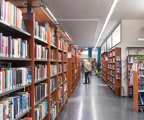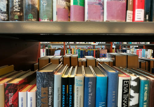 Pitkä kirjahyllyrivi Raision kirjastossa