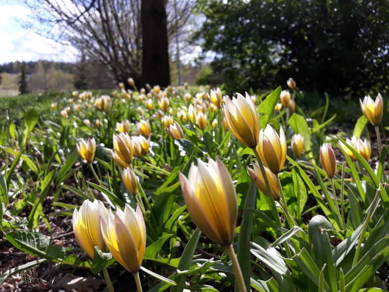 Parvitulppaanit kukkivat runsaasti puistossa.