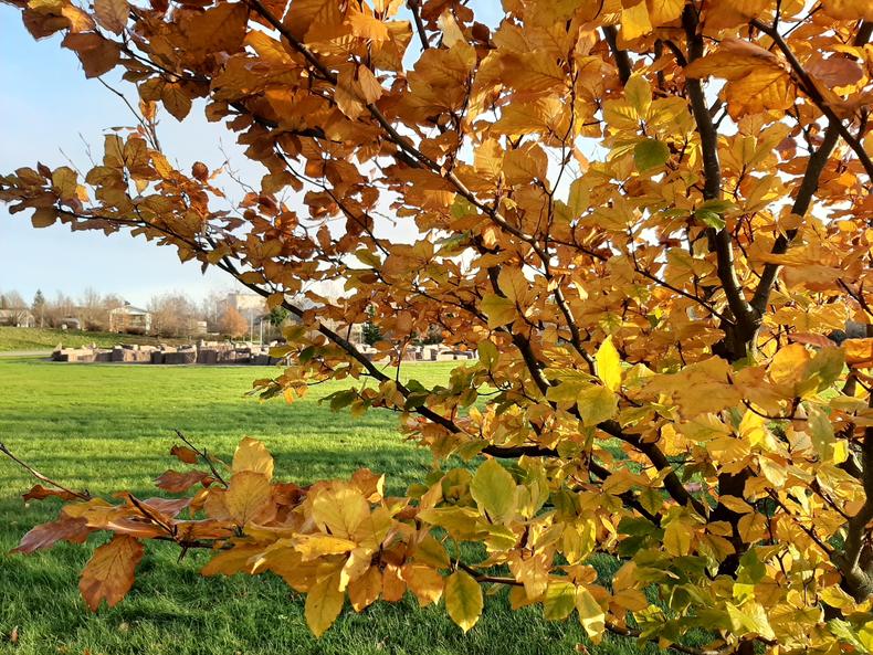Euroopanpyökin keltaisia oksia, taustalla näkyy kivilabyrintti.