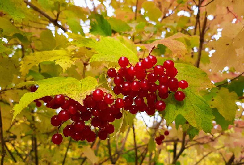 Punaiset koiranheiden marjat syksyn lehtien lomassa.