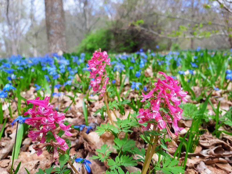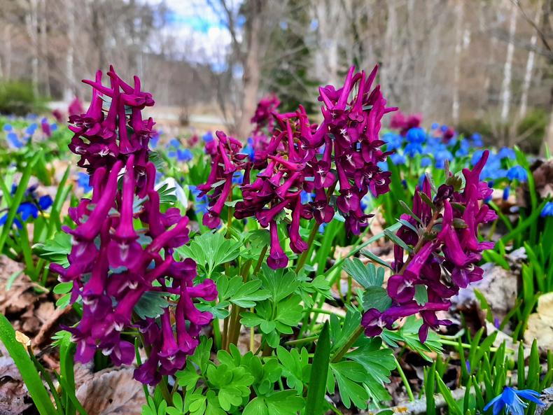 Etualalla purppuran värisiä koiranhammasliljoja, taustalla scilloja.