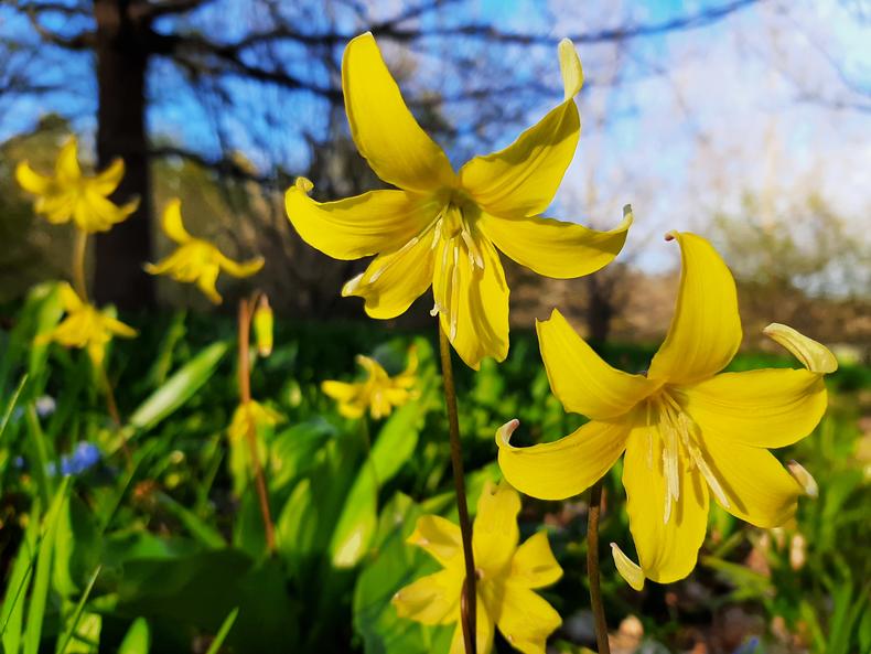 Keltaisia koiranhammasliljoja, aurinko paistaa taustalla.