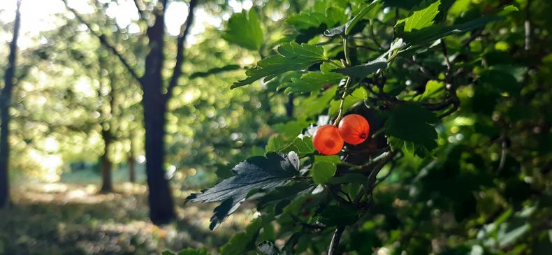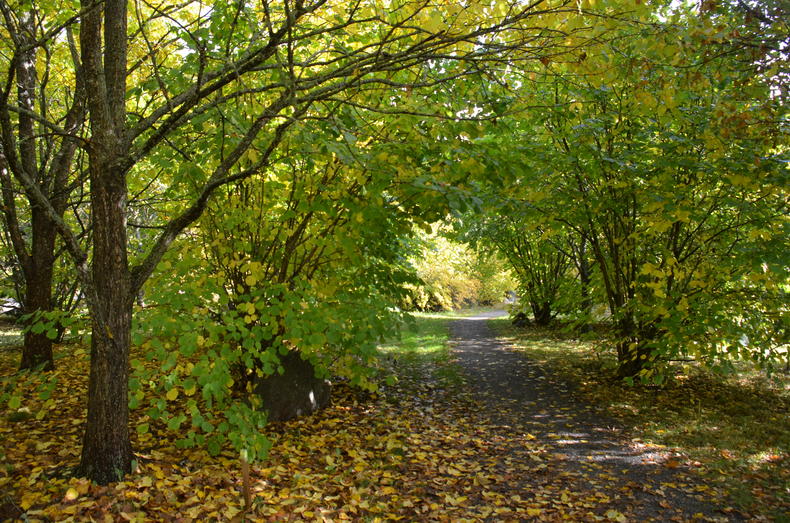 Pähkinäpensaat luovat vehreän tunnelin puistokäytävälle.