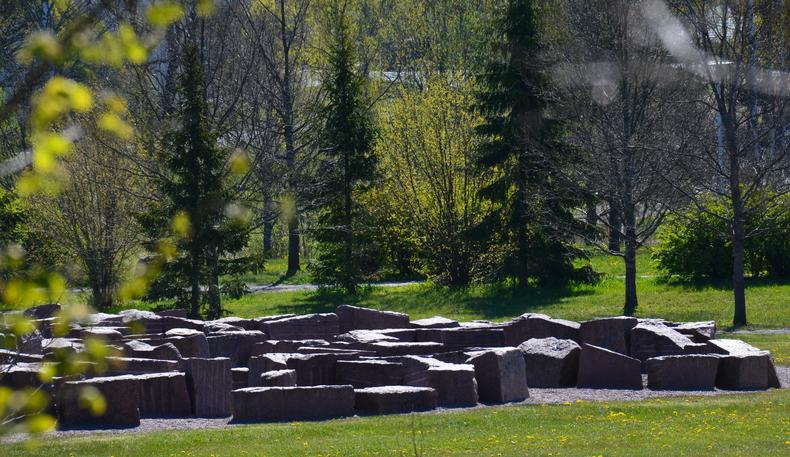 Etualalla kivilabyrintti, taustalla keväisiä puita.