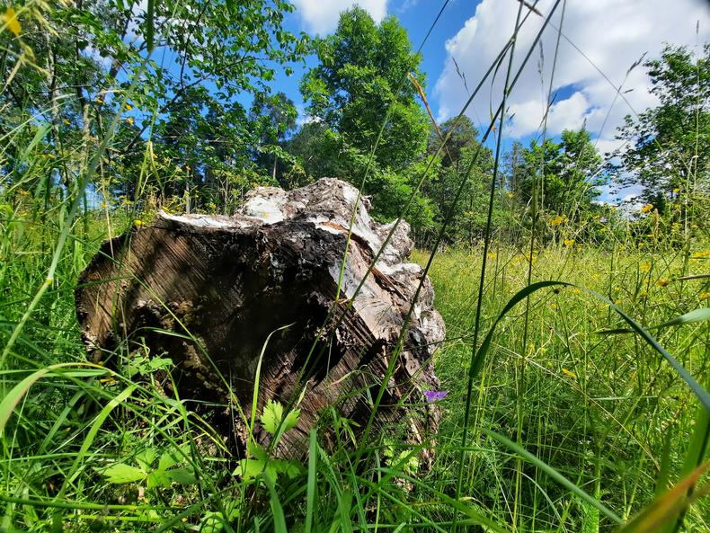 Koivun runko lahopuuna kauniissa kesämaisemassa.