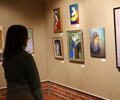 Henkilö katsoo taideteoksia näyttelyssä