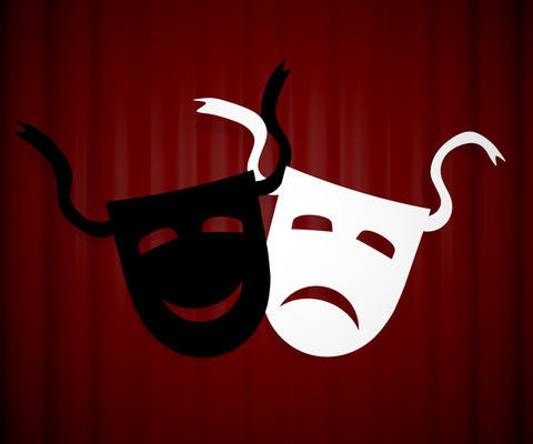 Kuvassa teatterimaskit, ilo ja suru.