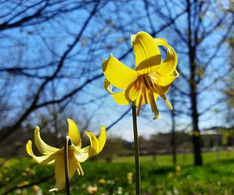 Keltaisia koiranhammasliljoja auringonpaisteessa Karmelinpuistossa.