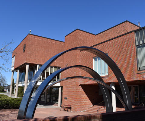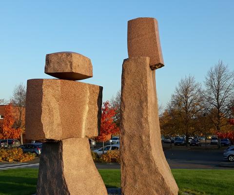 Tiilirakenteinen Raision kaupungintalo. Etualalla metallinen Kaaret taideteos.