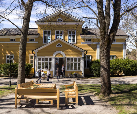 Hintsan keltainen kartano taustalla. Aurinkoinen päivä.