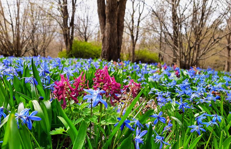 Karmelinpuistoon on istutettu usean vuoden ajan pikkusipuleita. Huhti-toukokuussa puiden katveesta löytyy mm. keltaisia talventähtiä, lumikelloja, lumipisaroita ja posliinihyasintteja sekä eri värisiä koiranhampaita ja kiurunkannuksia sekä Kaukaasiasta kotoisin olevia villitulppaaneja. Voimakkaan siniset kevättähdet ja idänsinililjat leviävät suurena kasvustona puiden alla.