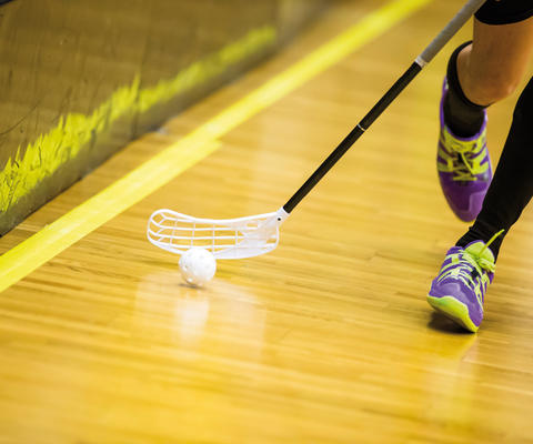 Sählyn pelaaja kuljettaa palloa parkettia pitkin.