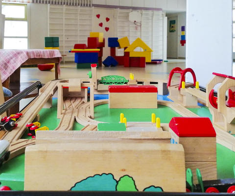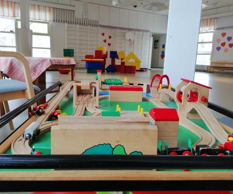 Petäsmäen päiväkodin sali. Etualalla lelu.